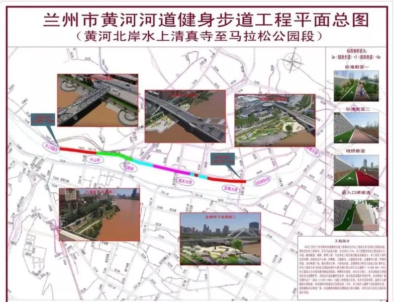 蘭州市黃河河道健身步道工程(黃河北岸水上清真寺至馬拉松公園段)位于黃河北岸河灘,全長2924.317米,西起黃河北岸金城關(guān)古建一條街水上清真寺,沿途經(jīng)過中山橋、元通黃河大橋、羅鍋溝洪道、音樂噴泉廣場、城關(guān)黃河大橋、大砂溝洪道、金雁黃河大橋至馬拉松公園。主要建設(shè)內(nèi)容包括人行步道、健身跑道、棧橋、照明工程、生態(tài)美化工程、相關(guān)配套設(shè)施及中山橋、元通大橋、金雁大橋下和音樂噴泉廣場節(jié)點景觀改造。