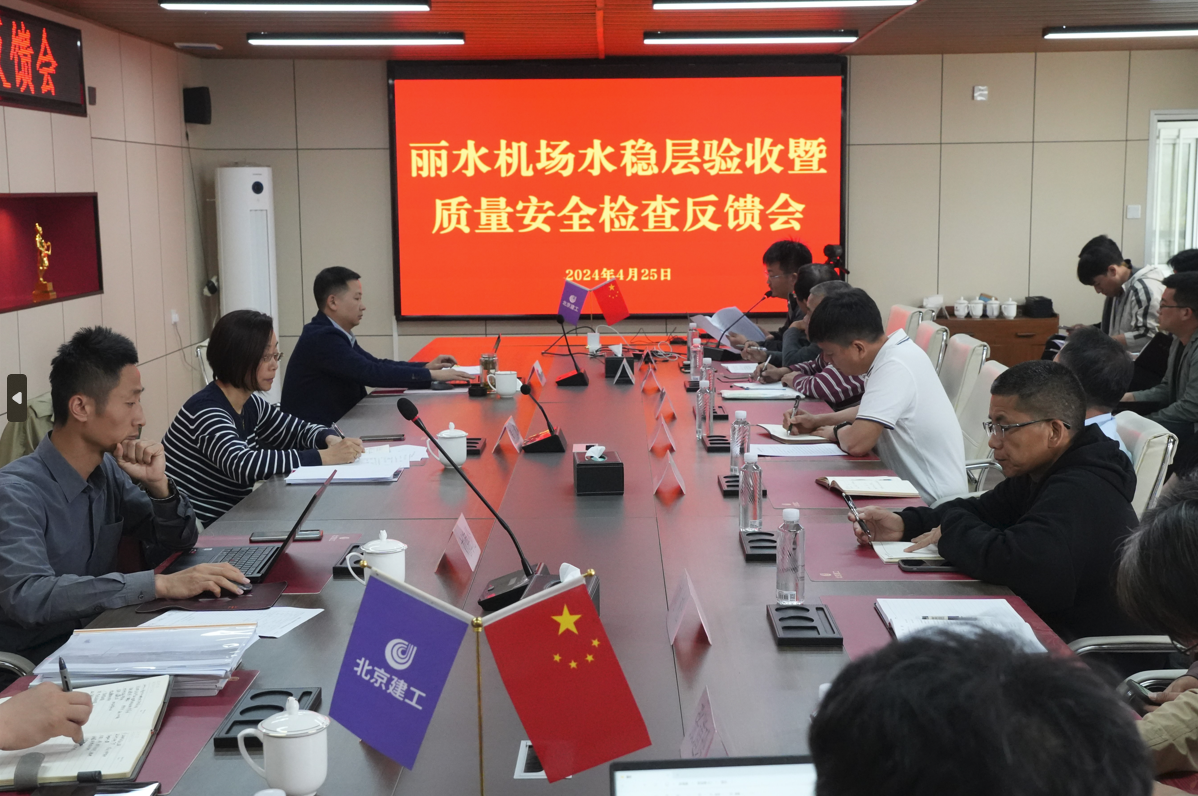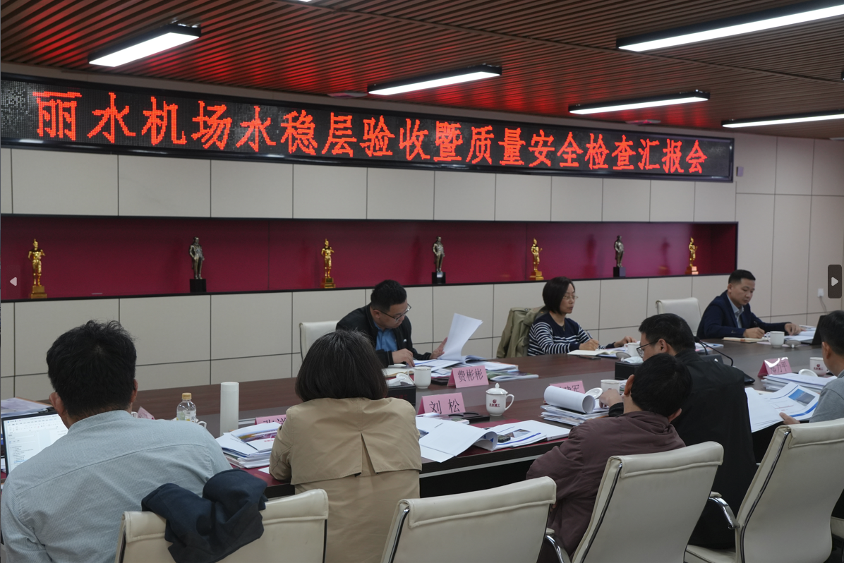 4月23日,檢查組聽(tīng)取了我司麗水機(jī)場(chǎng)項(xiàng)目部工作匯報(bào),詳細(xì)了解了項(xiàng)目進(jìn)展情況和本次道面基層分部驗(yàn)收、道面面層試驗(yàn)段施工情況。